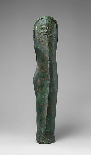 This work of art is currently on loan to the museum.The upper portion, covering the knee, is embellished with a particularly fierce gorgoneion (Gorgon's face). The eyes still contain some of the original amber inlay.