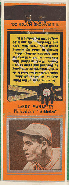 - Title: Leroy Mahaffey, Philadelphia Athletics, from the Baseball Players Match Cover design series (U1) issued by Diamond Match Company