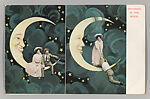 At the height of the picture postcard craze in the early twentieth century, photo studios at beach resorts, state fairs, carnivals, and downtown arcades offered a variety of playful props and backdrops for sitters to pose against. During the same period, there was a resurgence of popular interest in the romance of the Moon, as evidenced in countless Tin Pan Alley songs, such as "Shine On, Harvest Moon" (1908), "By the Light of the Silvery Moon" (1909), and "I’ll Sit Right on the Moon and Keep My Eyes on You" (1912). Given this confluence, it is not surprising that one of the most popular studio props was the "paper moon," a cut-out crescent moon set in front of a backdrop painted with stars and the occasional comet (inspired by the passing of Halley’s comet in 1910). Decades before the first spacecraft were launched into orbit, thousands of individuals commemorated their own imaginary lunar voyages with these charming photographic souvenirs.