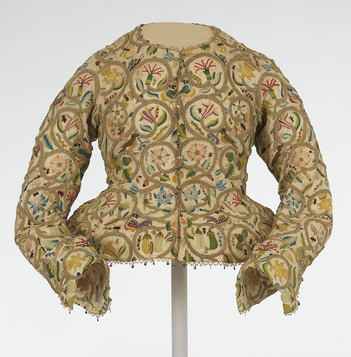 In this informal bodice, known as a ‘waistcoat’ in the seventeenth century, floral and vegetal motifs are accounted for with scientific clarity but assembled along traditional continuous meanders. Like seventeenth-century still-life painting in its global reach and analytical approach, the jacket suggests both abundance and taxonomy.