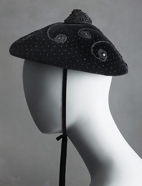 This work of art is currently on loan to the museum.This hat form, a version of which Valentina first encountered in the early 1920s as theatrical costume when she belonged to a theater troupe, recalls the shape of broad-brimmed hats worn for centuries in China as protection from the elements. Variations of the type appeared in her collections for decades, and Valentina was particularly fond of wearing the style herself. This example was originally worn by the actress Lillian Gish, a longtime client of Valentina’s.