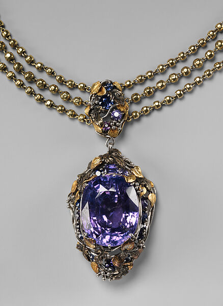 This work of art is currently on loan to the museum.Although his earliest work was as a painter, Louis C. Tiffany is best known as an exceptional designer of decorative arts, from glass and ceramics to metalwork and jewelry. It was not until after the death of his father, Tiffany & Co. founder Charles L. Tiffany, in 1902 that Louis began to design his own jewelry. Among the first pieces of his jewelry to be exhibited were the 27 examples displayed to international acclaim at the 1904 Louisiana Purchase Exposition in St. Louis. Here, as in so many of his jewelry designs, he selected gemstones that would diffuse and transform light—as, for instance the large violet sapphire which is the focal point of this necklace. The naturalistic grapevine ornament was one of his favorite motifs. It can be compared to an earlier necklace in the Met’s collection, which features grape clusters and leaves set with tiny black opals and enameled gold (46.168.1).