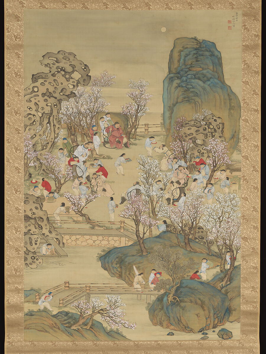 In a garden of spring blossoms and mountain-shaped boulders, a group of gentlemen relax, converse, and accept wine and delicacies from youthful boy-attendants. Eroded ornamental garden rocks like those from Lake Tai identify the scene as taking place in China. A hazy moon hangs in the sky while bands of mist, rendered by unpainted areas of silk, obscure the far distance. The poetic title derives from an early, perhaps original, box inscription.