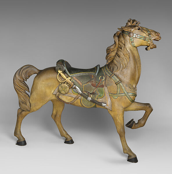 During the heyday of the carousel industry in the early twentieth century, D.C. Müller & Bro. of Philadelphia produced hundreds of hand-carved animals ranging from horses to goats to zebras. They were assembled from multiple pieces of wood and intricately painted to accentuate their physical and behavioral characteristics. The animals, especially those placed on a carousel’s outside row, feature extraordinary attention to detail intended to delight riders young and old. This military-style horse has a saddle fashioned after the Civil War McClellan design and a cavalry saber, as well as realistic glass eyes and steel horseshoes.