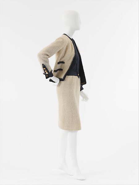 Chanel's most iconic design, immediately recognizable in its endless permutations, is her two- or three-piece suit. Although introduced in the teens, it was only after 1954 that the design came to incorporate such typical features as gilt buttons and braiding to outline and reinforce the hem, cuffs, and lapels of the jacket. Soft and untailored, Chanel's suits, often made from light, loosely woven tweed, exemplify her impulse toward ease and comfort. Skirt pleats and jacket sleeves with high-cut armholes facilitate movement, while blouses, often designed to match the lining of the jacket, reveal practical details such as buttons with workable buttonholes and self-tie bows that suggest versatility within simplicity.