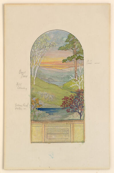 Although the window is unsigned, the fact that it was a suggestion for a window for Emily Fairchild Northrop, Agnes Northrop’s mother, combined with the knowledge that landscape designs such as this were the particular province of Northrop’s work, leave no doubt as to its authorship. Northrop began with Tiffany in the mid-1880s and worked there throughout her entire career until the studios closed in the early 1930s. Tiffany relied heavily on Northrop’s facility in drawing landscapes and gardens that would be then incorporated into his studios’ window designs, including the Metropolitan’s own Autumn Landscape window that graces the entrance to the Charles Engelhard Court in the American Wing.