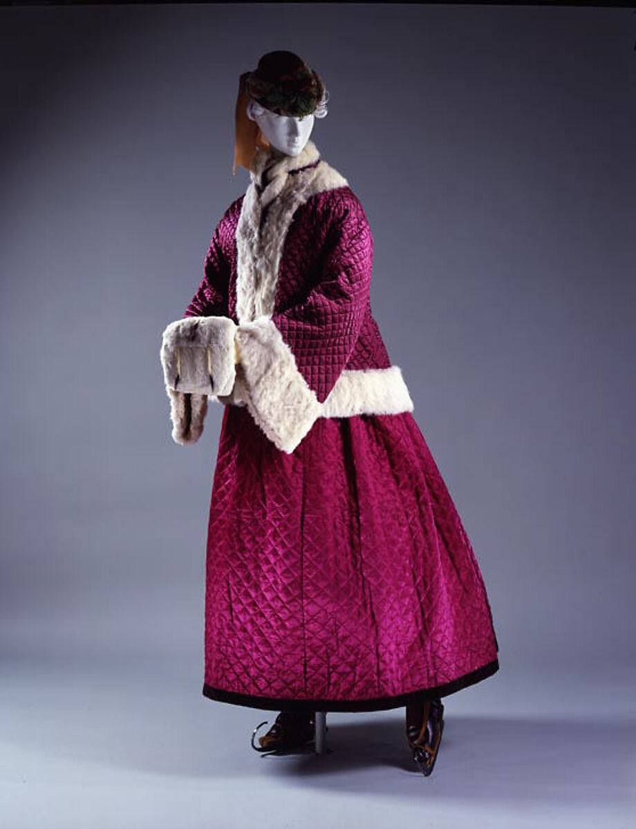 Sanguine in winter and vivid in the snow and ice-filled landscape, a skating ensemble cuts a colorful figure for the season. Of a recreation possible in nature only in winter, the skater is a friendly and familiar Currier and Ives avatar of the season. The quilting joins together an inner and outer layer, here with batting sandwiched in between, for further warmth.