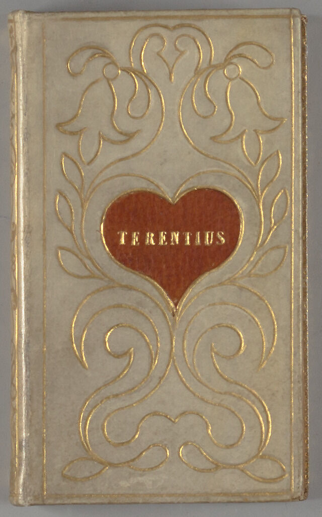 Binding: White vellum with gilt floral design, "Terentius" in mounted red vellum heart-shaped label in middle of front cover - "1822"in heart-shaped label on back cover , all edges gilt.