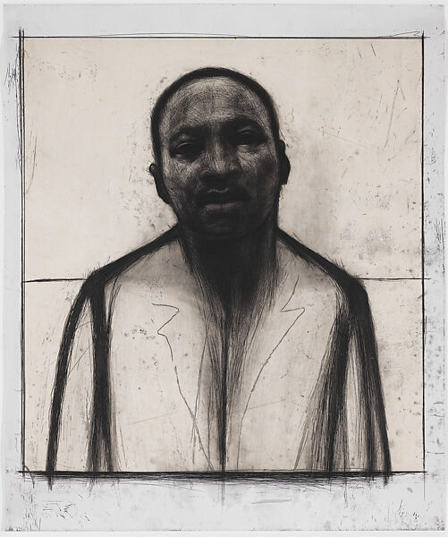 Working across mediums and formats, Wilson sought to portray the humanity of his subjects and promote social justice. Here, Wilson depicts the American civil rights leader Dr. Martin Luther King, Jr. at a more intimate angle than he was often shown in photographs. Wilson directs attention to King’s facial features, in particular, his deep, penetrating eyes. The artist emphasized King’s outline against a spare background, creating a halo effect that contrasts with his humble pose. A horizontal line divides the composition and, working in tandem with the vertical line that runs down the center of his body, produces the form of a cross, evoking both King’s work as a minister and addressing his assassination. Wilson created numerous works that depicted King, including a bronze bust commissioned for the U.S. Capitol.