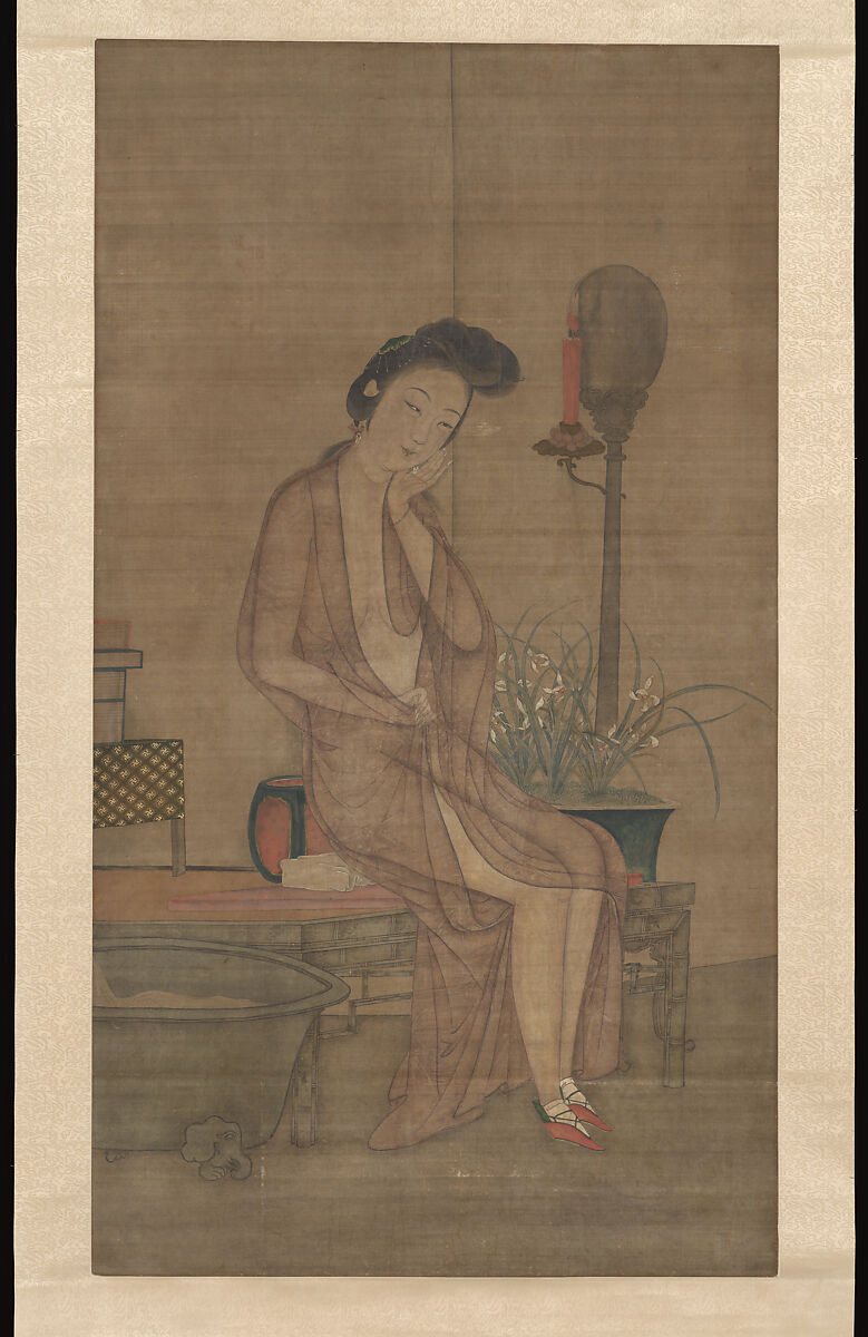 Partially clad in a sheer robe, a woman perches on the edge of a bamboo couch. A red candle burning in a sconce indicates that it is evening. Blossoming orchids in a basin to her right may symbolize hidden beauty, seductive fragrance, or scholarly talent, while the books at her right elbow indicate her learning. Beside the couch, a bath is being filled.