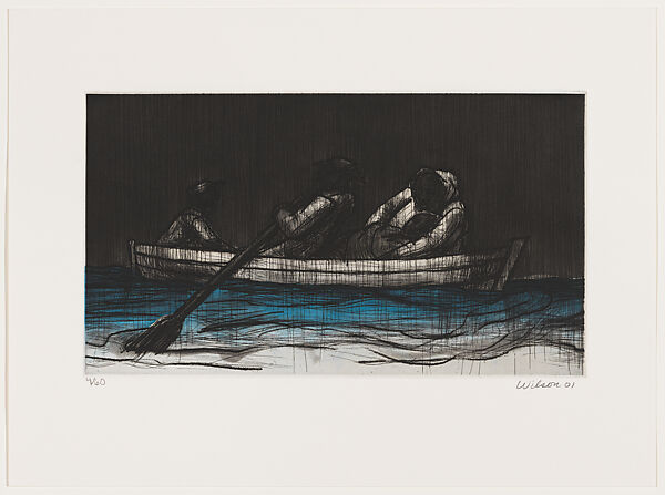 Throughout his life and work, Wilson drew inspiration from the writer Richard Wright, whose stories made him feel a sense of brotherhood with Black communities in the American South and their struggles. In 2001, the artist illustrated Wright’s short story "Down by the Riverside" (1938). Wilson considered technique and subject matter as intertwined elements of this project, drawing a close connection between the etching and aquatint techniques and the dark atmosphere of the flooding. This illustration shows the main characters, Brother Mann and Lulu, rushing to the hospital on a boat in a downpour. The scene encapsulates the book’s premise of a husband endeavoring to get his wife medical attention right before she gives birth—all amid the Great Mississippi Flood of 1927.