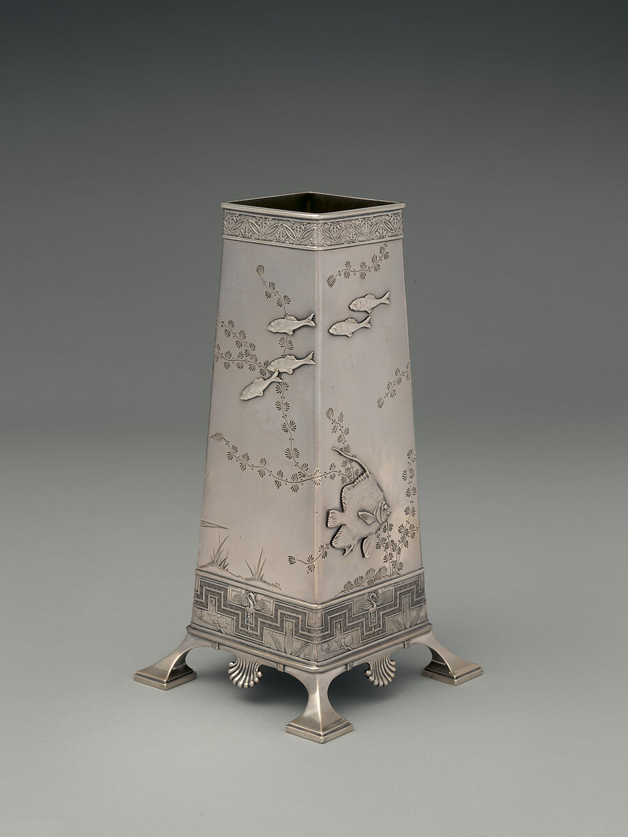 The opening of Japan to the West in the 1850s and subsequent displays of Japanese art at world’s fairs inspired great demand for Japanese-style objects in the United States. Edward C. Moore, the director of Tiffany’s silver department, was an early proponent and collector of Japanese art. The decorative motifs on this vase and their asymmetrical arrangement were clearly inspired by Japanese design. Originally, the vase had a lightly pebbled ground and oxidized accents that emulated Japanese metalwork. The silver workshop supervisor, Charles Gosjean, recorded in his diary that he visited the city's aquarium and also purchased fish from the Fulton Market, which he then had a colleague sketch. This dedication to close observation resulted in the highly accurate depictions of Chinese Brama fish on this vase.