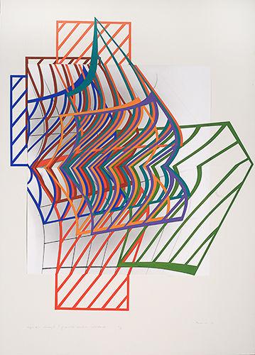 The Met's acquired series from Dóra Maurer was produced in 1976 from the more extensive Displacements series. The six pieces show eight rectangular shapes, crossed by diagonal lines, with each shape in a different color on top of a black grid. They are titled "displacements (a)" in the bottom right corner of the sheet, with numbers 1–6 on the back.