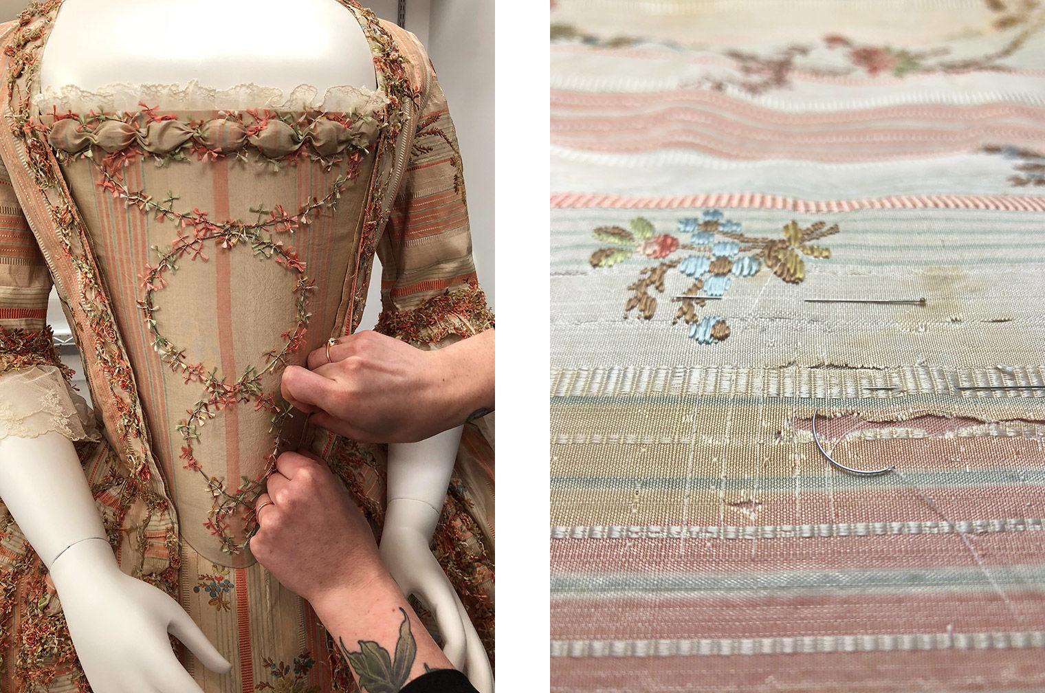 Left: Costume Institute Conservation Fellow Marina Hays pins in the reproduction stomacher she made for the robe à la française. Photo by Cassandra Gero. Right: During treatment of the skirt on the robe à la française, laid and couching stitches with fine silk thread and a new backing fabric are used to stabilize the damaged area. Photo by Marina Hays. Robe à la française (details), 1775–1800. French. Silk. The Metropolitan Museum of Art, New York, Purchase, Irene Lewisohn Bequest, 1961 (C.I.61.13.1a, b)