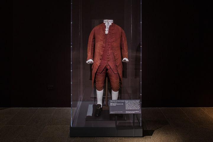 Perhaps the most iconic ensemble in the exhibition is the plum-silk three-piece suit worn by Benjamin Franklin to the signing of the Treaty of Amity, which is currently in the collection of the Smithsonian's National Museum of American History. Purchased by Franklin in France in 1779, the suit was the height of elegance while also reflecting the sober democratic ideals of the newly created American Republic through its spare surface embellishment. This suit is such a rare and important garment that it is almost never displayed, due to conservation concerns.