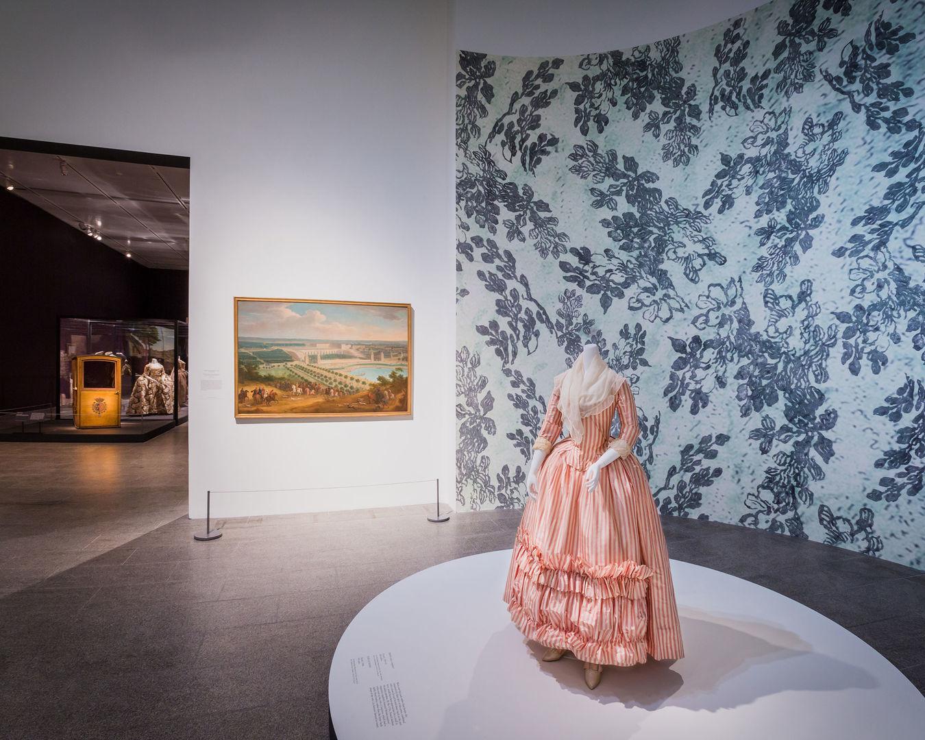Installation view of Visitors to Versailles. Right: Robe à l'anglaise, 1785–87. French. Silk. The Metropolitan Museum of Art, New York, Purchase, Irene Lewisohn Bequest, 1966 (C.I.66.39a, b). Visible at left: Robe à la française, 1775–1800. French. Silk. The Metropolitan Museum of Art, New York, Purchase, Irene Lewisohn Bequest, 1961 (C.I.61.13.1a, b)