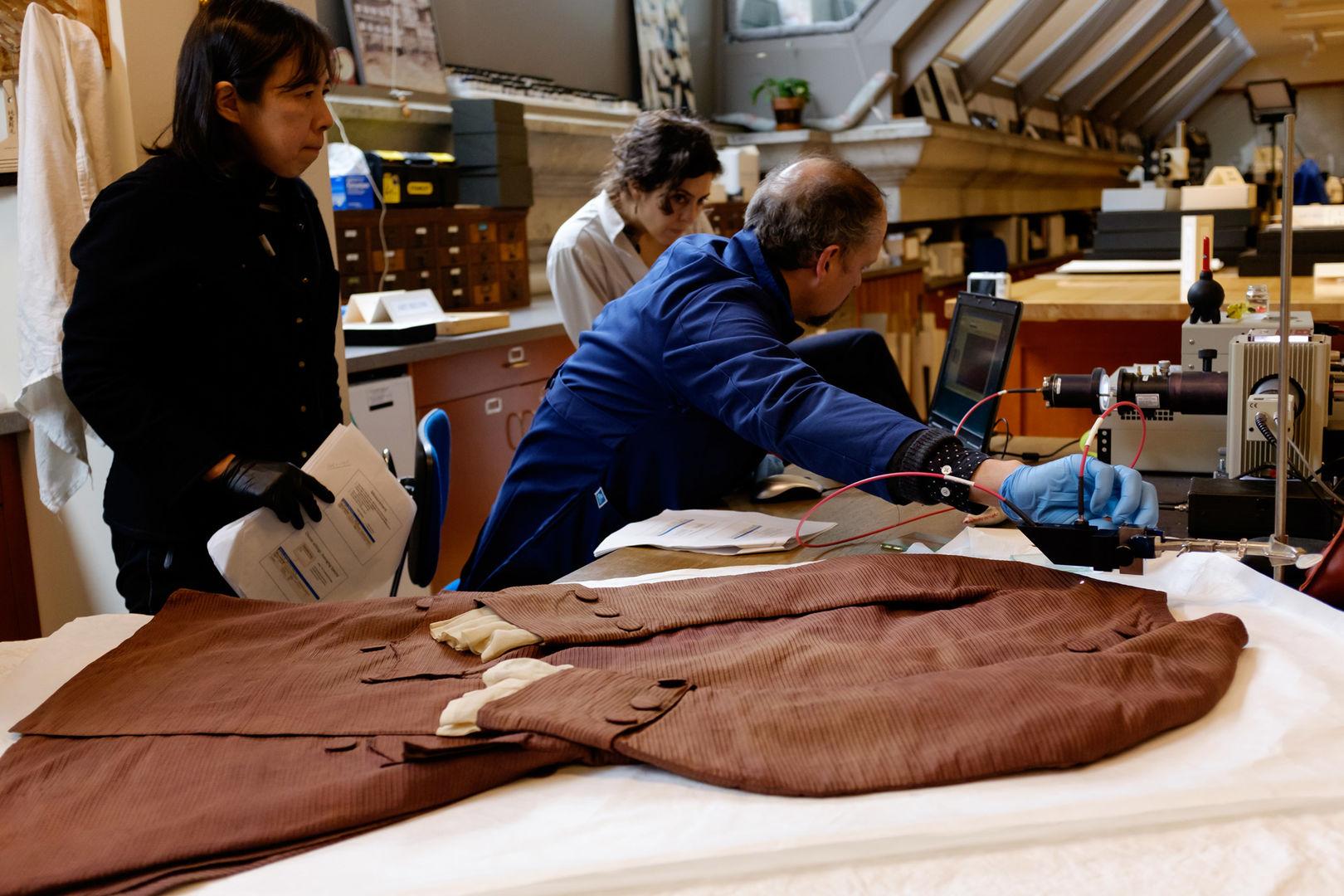 Research Scientist Nobuko Shibayama (left), Conservation Assistant Christopher Mazza (right), and Sarah Scaturro (rear) perform a microfading test on Benjamin Franklin's suit.