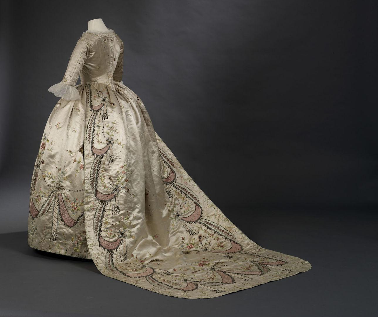 Attributed to Marie-Jeanne "Rose" Bertin (French, 1747–1813). Formal ball gown (robe parée), 1780s (with later alterations). French. Silk satin, with silk embroidery, appliqués of satin; metallic threads, chenille, sequins, applied glass paste; 84 5/8 x 41 3/4 in. (215 x 106 cm). Royal Ontario Museum, Toronto (925.18.3.A–B)