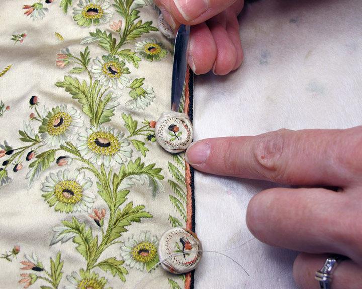 The silk-covered buttons of the waistcoat of the man's habit à la française received treatment before it could be safely dressed and displayed. Photo by Cassandra Gero