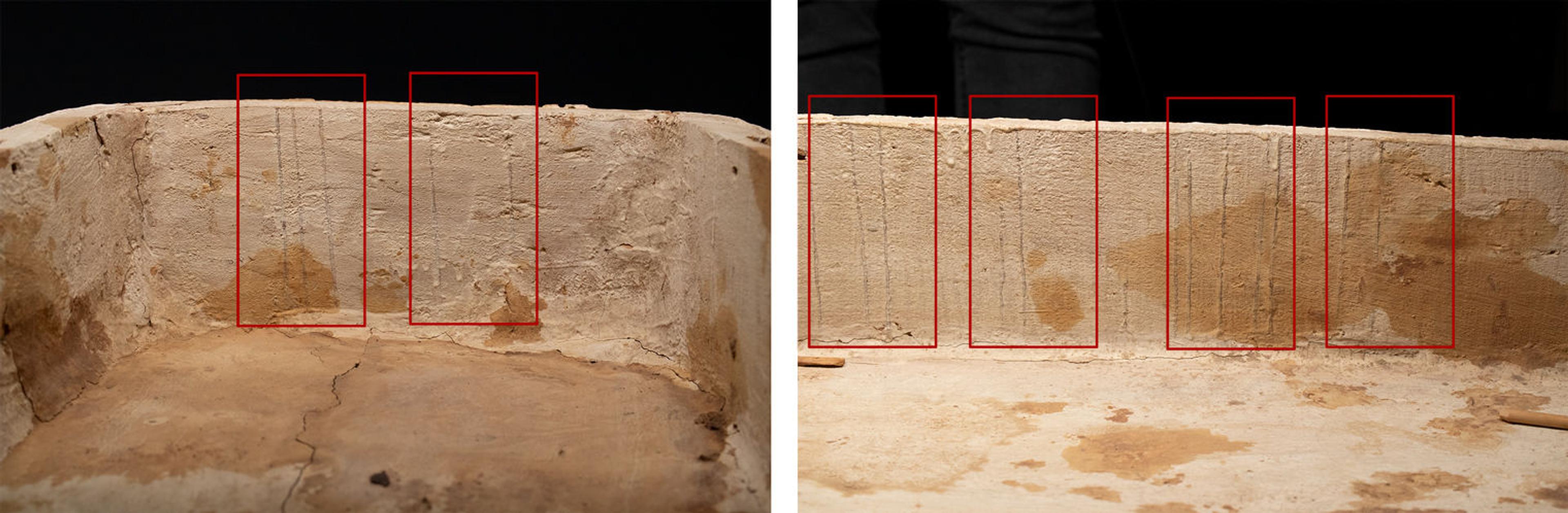Thin, slightly raised lines are visible along the interior sides of both the box and lid, consisting of a dark brown material. These lines sit directly on the wood, below the paste layer. Some of the lines on the lid match up spatially with lines on the box, while others do not. Several of the same lines are also present on the exterior sides of the box and on the interior back surface of the box in the head area. Analysis with Fourier Transform Infrared Spectroscopy determined that the material is a proteinaceous (animal-derived) glue.[12]