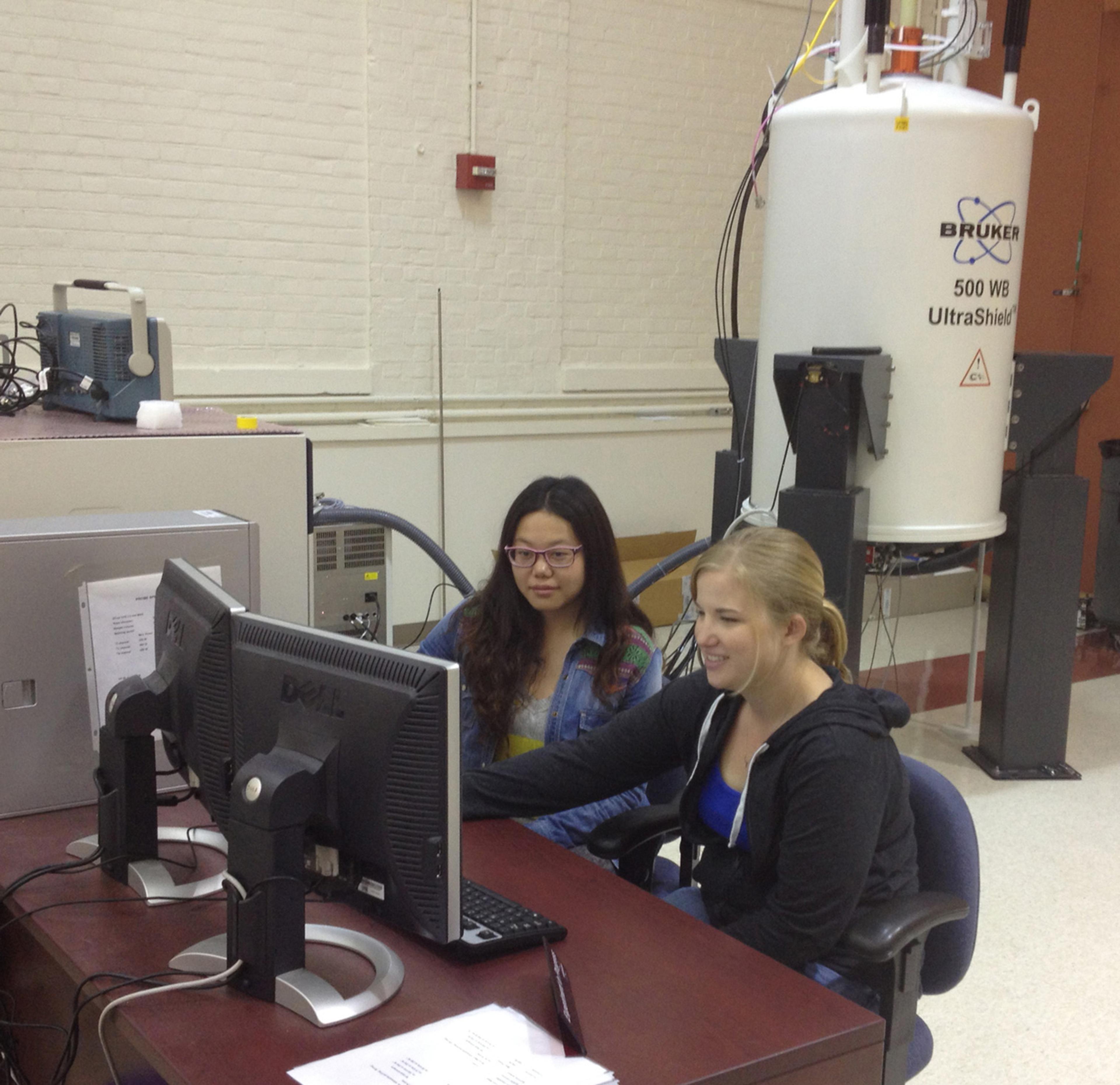 University of Delaware students Anna Murphy and Yao Yao using the solid-state NMR spectrometer