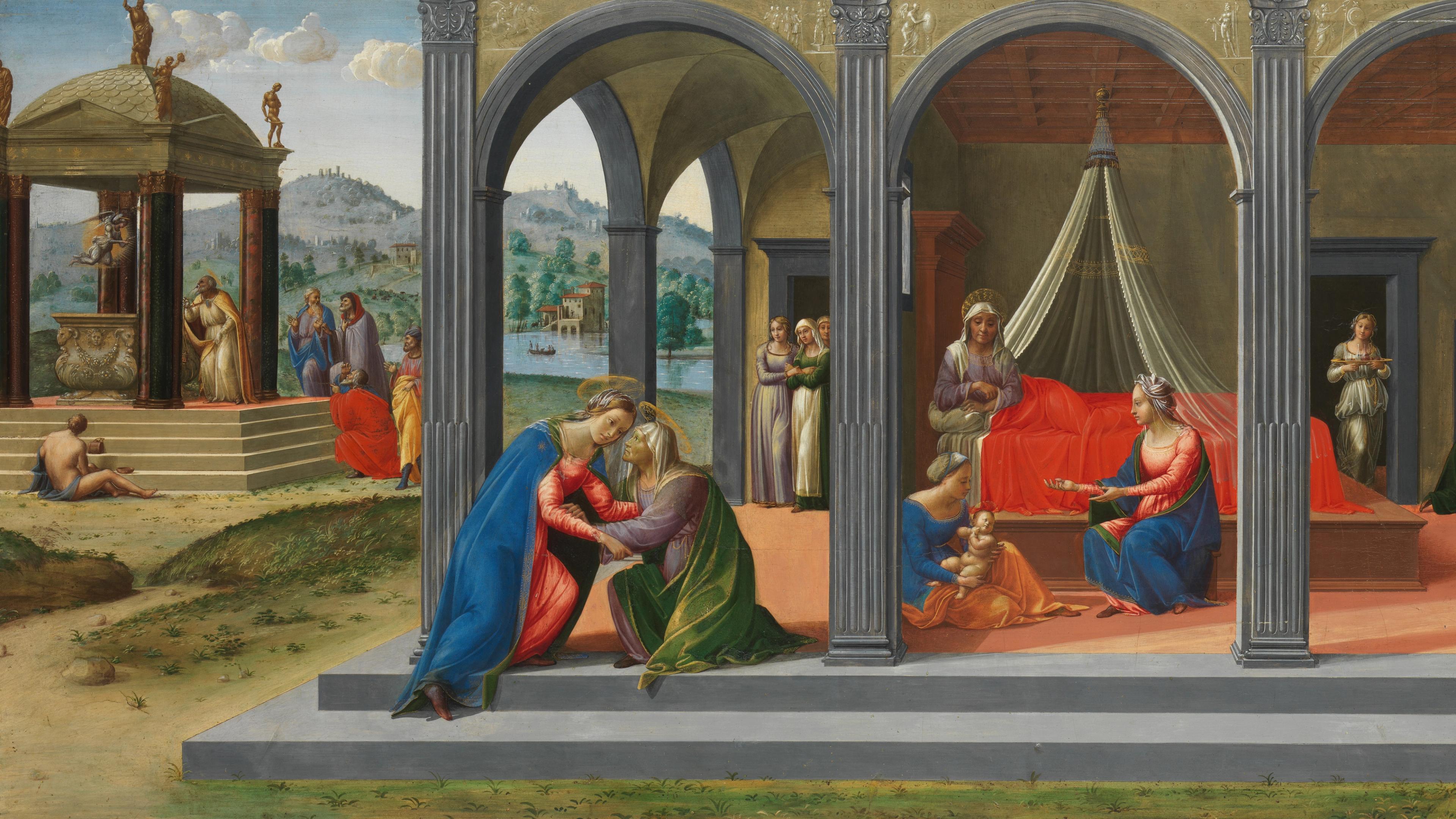 Francesco Granacci (Italian, 1469–1543). Scenes from the Life of Saint John the Baptist, ca. 1506–7. Tempera, oil, and gold on wood, 30 9/16 x 59 1/2 in. (77.6 x 151.1 cm). The Metropolitan Museum of Art, New York, Purchase, Gwynne Andrews, Harris Brisbane Dick, Dodge, Fletcher, and Rogers Funds, funds from various donors, Ella Morris de Peyster Gift, Mrs. Donald Oenslager Gift, and Gifts in memory of Robert Lehman, 1970 (1970.134.1). The cross-section of a paint sample removed from the grass area, in lower right border, was found to contain lead soaps protruding through the paint surface that give rise to the granular to surface texture of the paint