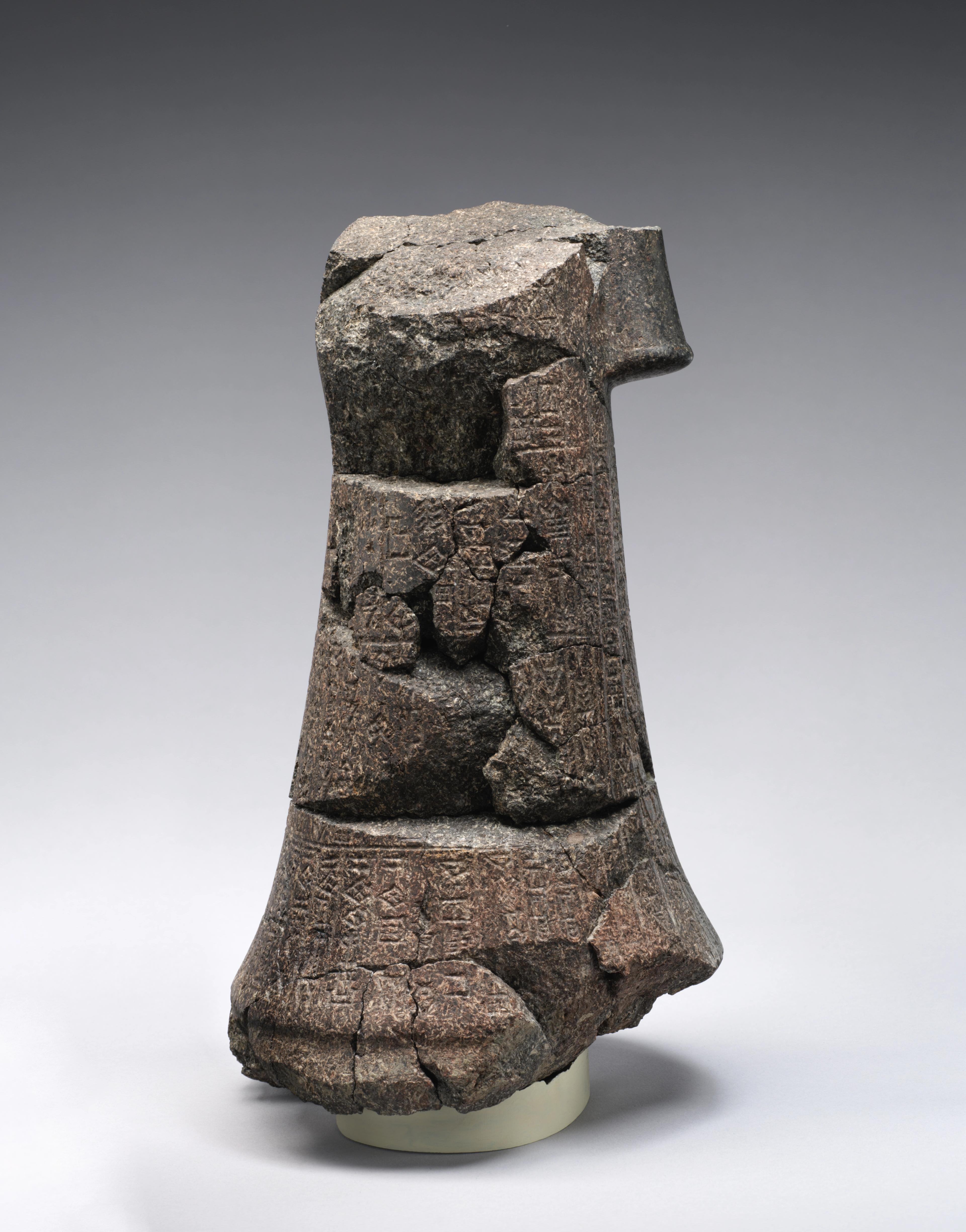 This statue, made out of black hornfels, is attributed to King Shulgi of Ur (c. 2094–2046 BCE) due to the content of the Sumerian inscription carved on it. This inscription names the king and the personnel of the temple estate of the god Nindara—a local deity who was worshipped particularly in the ancient state of Lagash in southern Mesopotamia in modern-day Iraq. Additionally, in typical Mesopotamian fashion, the statue was given a specific name: “Shulgi, who has been given strength by Nindara, is the breath of life of the city.” Although the upper body of this figure is not preserved, the fragmentary object seen at the waist level suggests that the king might have held a stand or a vessel in his clasped hands, most likely associated with a libation ritual.[i]