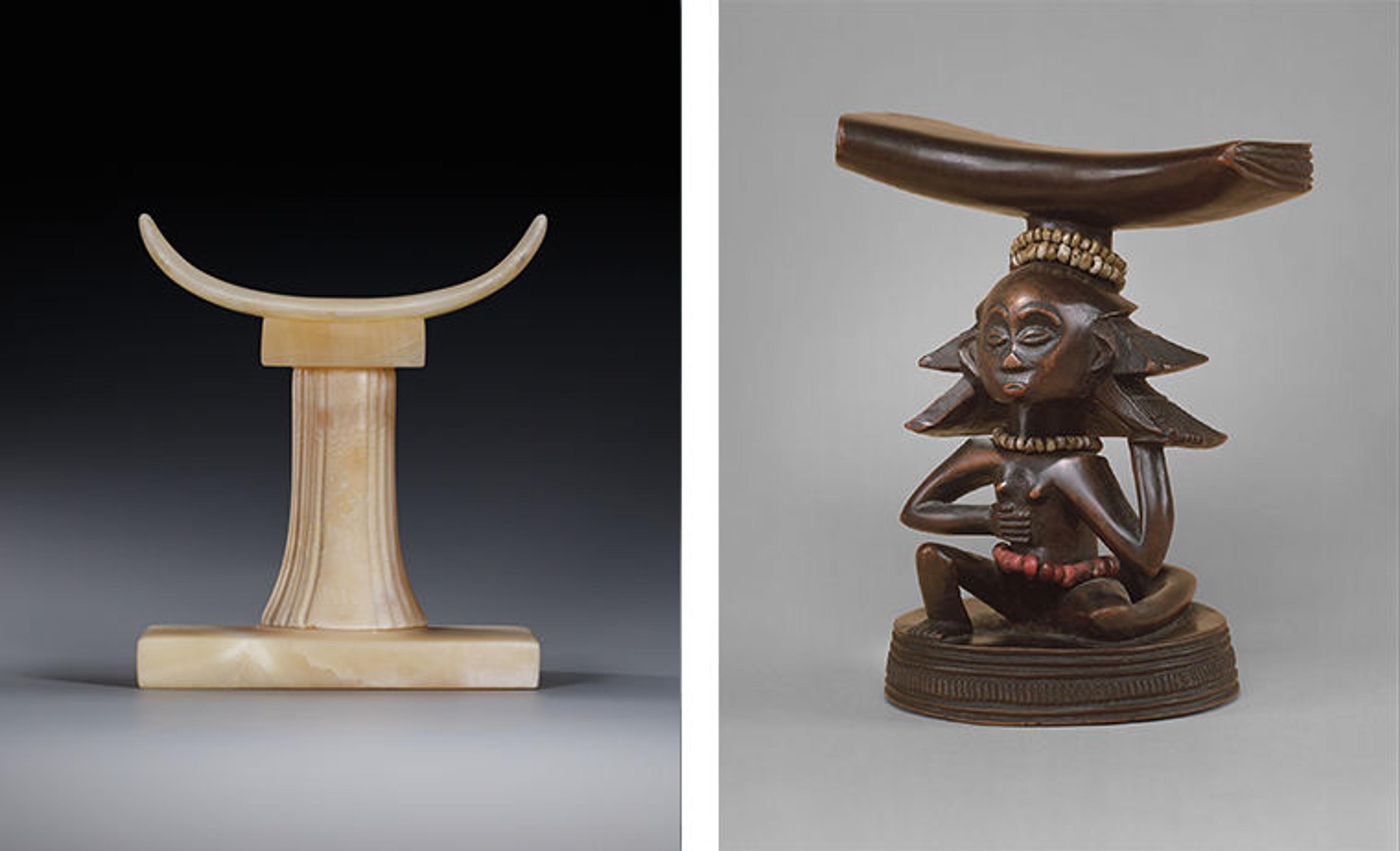 Right: Headrest: Female Caryatid Figure, 19th century. Master of the Cascade Coiffure; Shankadi region, southeastern Democratic Republic of the Congo (1981.399)