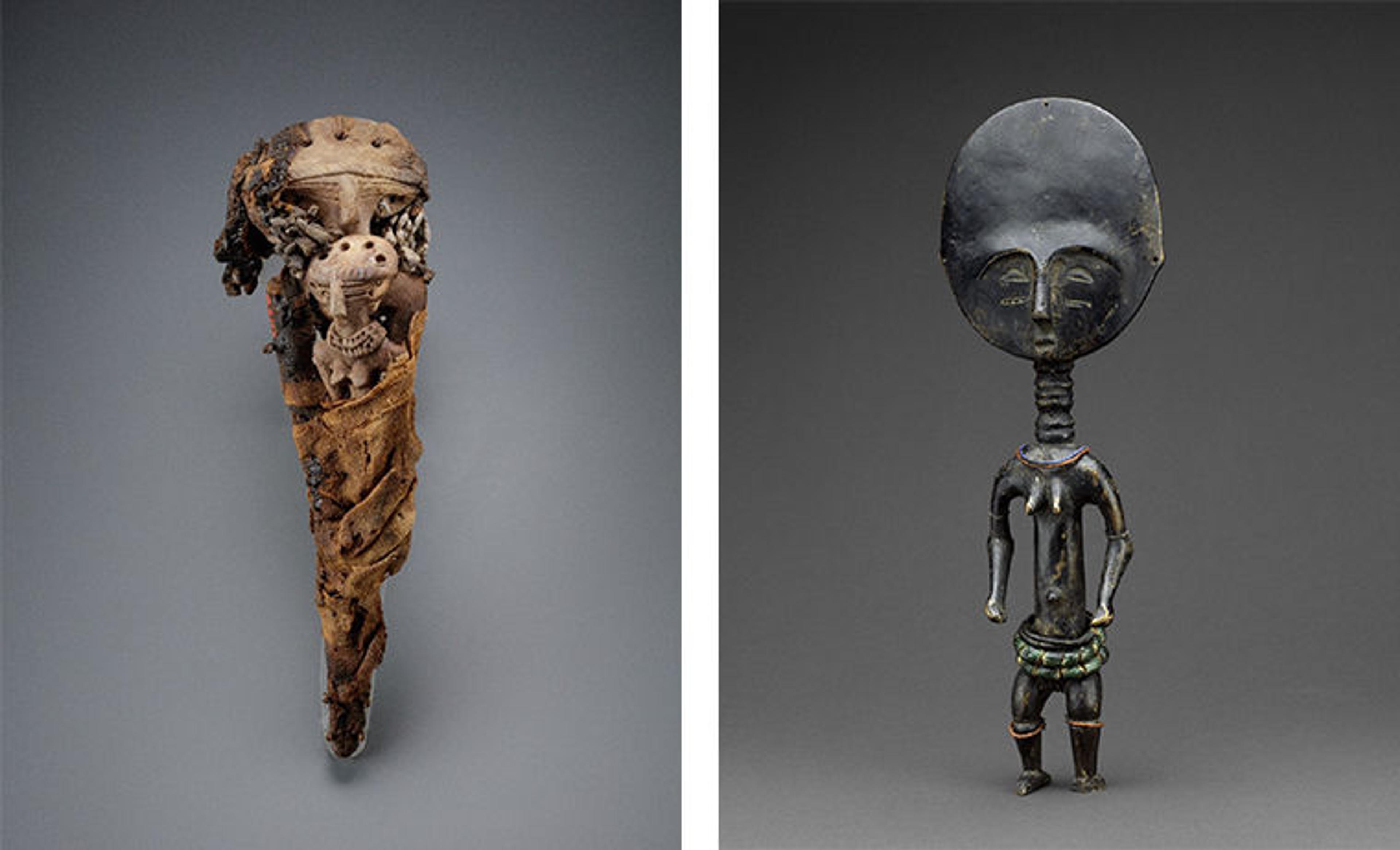 Right: Commemorative Portrait of a Chief (Singiti), late 19th–early 20th century. Hemba artist; Upper Congo River, Democratic Republic of the Congo (2015.119)