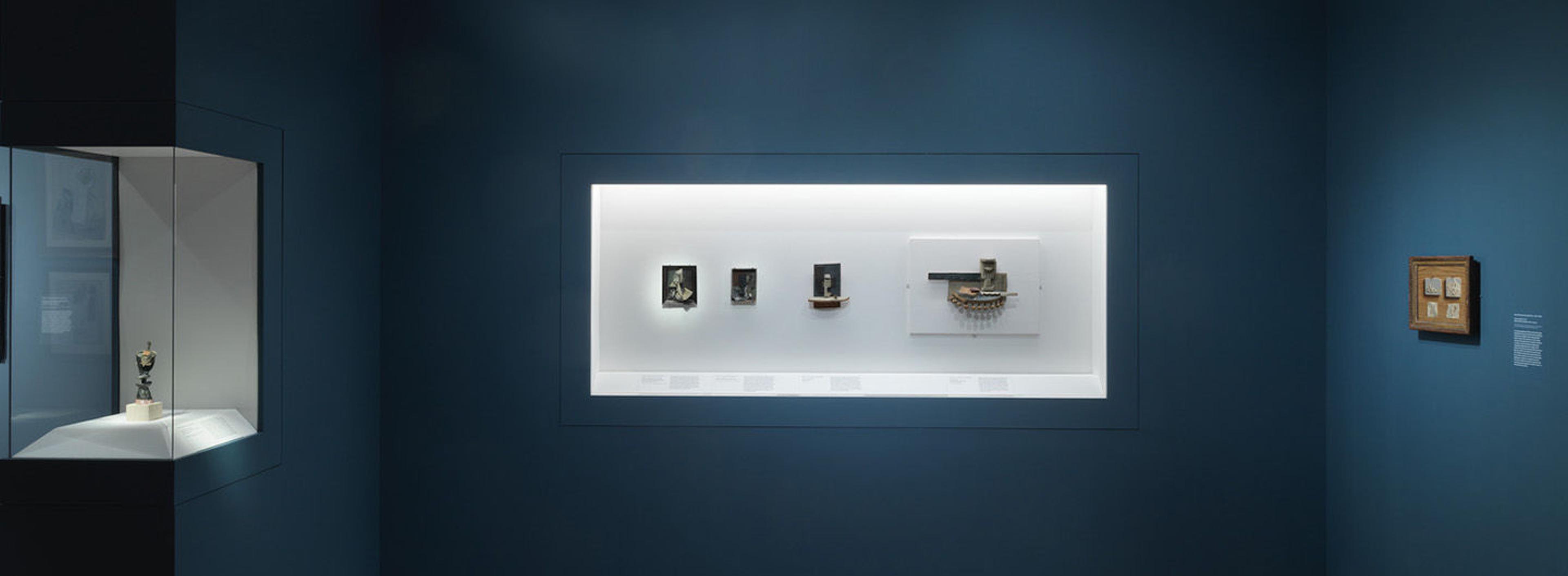 The term paragone (Italian for “comparison”) refers to debates conducted during and after the Renaissance about which art form could best “imitate nature,” painting or sculpture. Although Cubism was defiantly not imitative, in using novel collage and construction techniques, Picasso made the case for hybrid modes of expression and explored the potential for creative exchanges between these supposed rivals. Still life was traditionally considered too lowly a subject for the art of sculpture and suited only to painting. Picasso challenged this assumption, and the sculptures he constructed in 1912–15 are tabletop still lifes that often parody trompe l’oeil devices. Nearly all are reliefs—the type of sculpture closest to painting. The papiers collés displayed in this room explore the same subject matter as Picasso’s constructions: always involving a built-up surface, these collages mediate between his two-dimensional paintings and three-dimensional reliefs. He gave color and pattern as vital a role in his sculpture as in his painting, sometimes simulating materials he never used (notably marble) and playfully juxtaposing hand-painted shadows with real ones cast by projecting elements. Deceiving, perplexing, and thereby stimulating the intellect—moving beyond trompe l’oeil to trompe l’esprit, “fool the mind”—was a key Cubist goal.