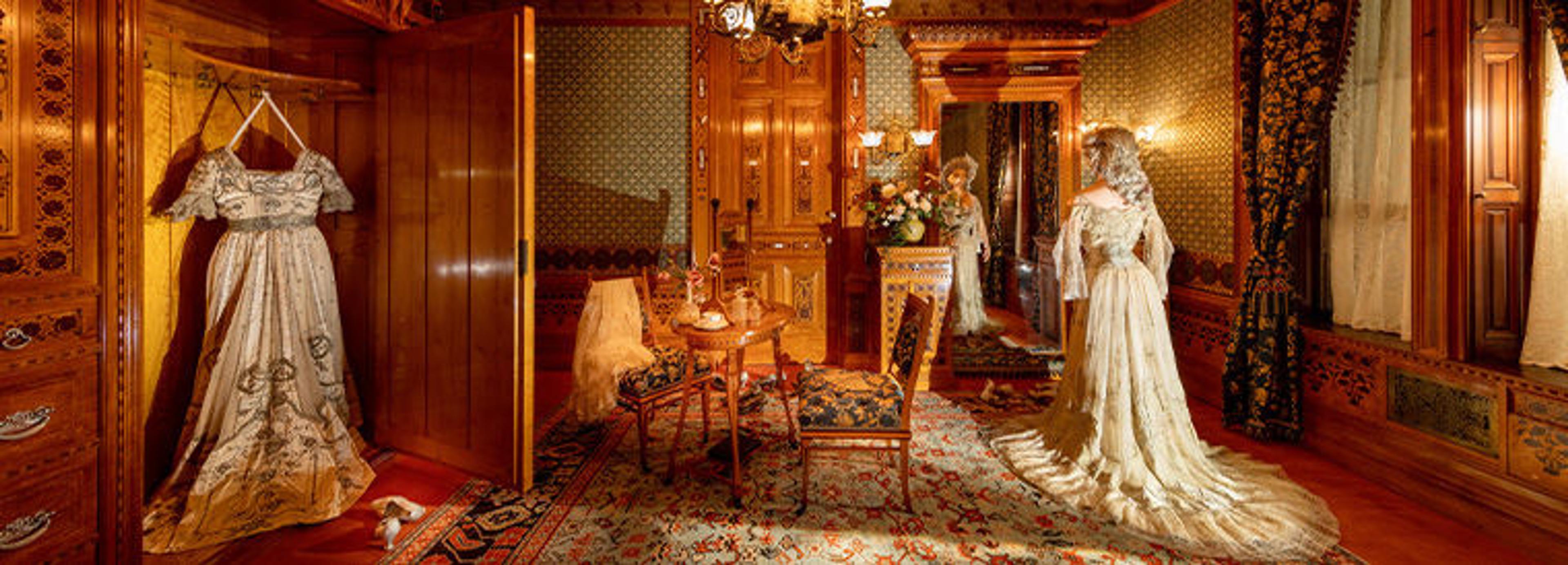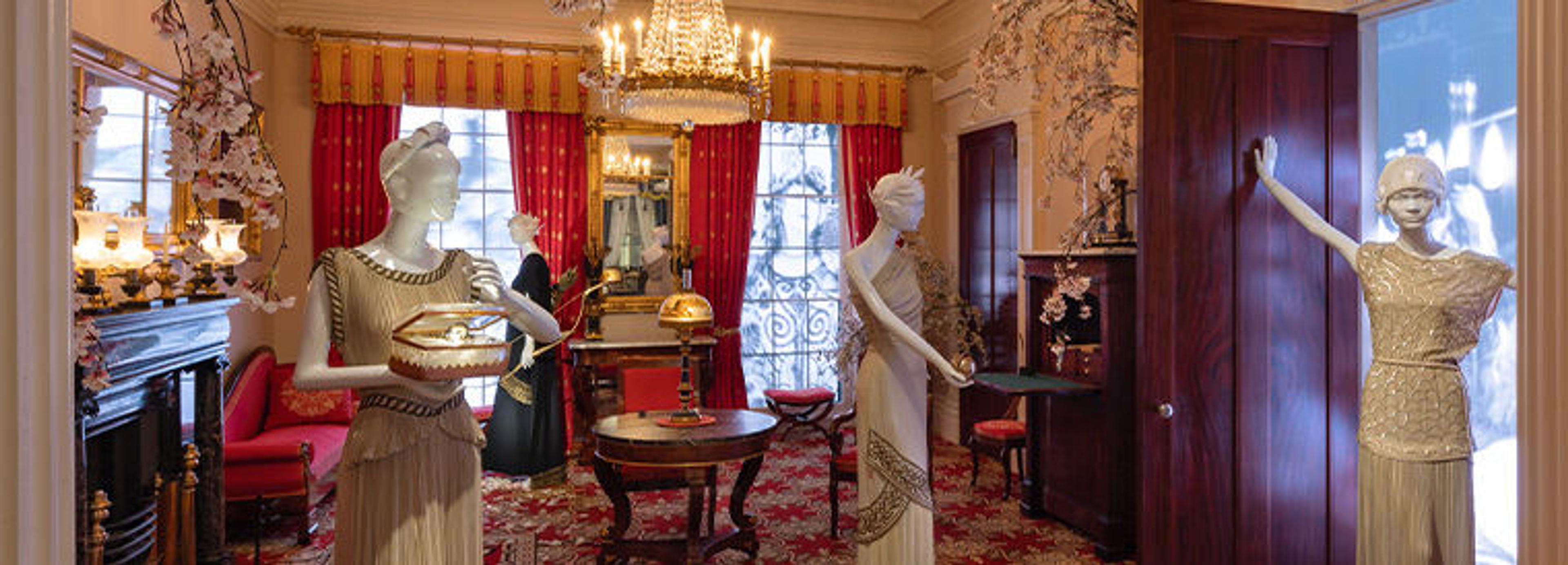 Like the Worsham-Rockefeller Dressing Room’s decor, the evening gown displayed here was designed to interact with ambient lighting, which created glinting effects on the meticulously sewn embroidery of opalescent bugle beads and silver thread and paillettes. Designed by Lucie Monnay, a Swiss immigrant who established herself in New York in the late 1880s, the dress displays a quality of finish and sophistication of embellishment equal to French couture. Its original wearer, Annie-May Hegeman (1859–1948), an amateur embroiderer and collector of antique textiles, appreciated fine handwork and patronized both French and American couturiers. The evening dress shown within the Worsham-Rockefeller wardrobe, created by the Parisian couture house Jeanne Hallée and also worn by Hegeman, similarly reflects her taste for lavish embroidery.