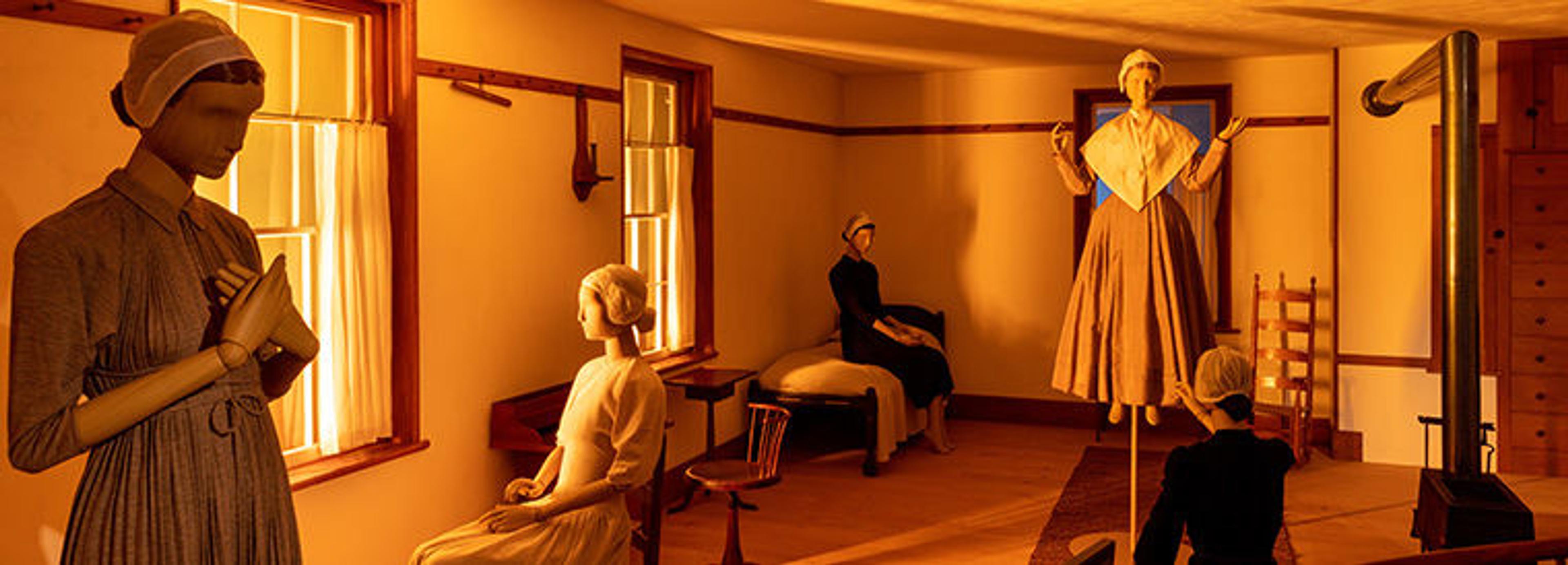 McCardell extended the modest aesthetic of her “Nada” and “Monastic” designs to her “Cloister” dress, so named by its eventual manufacturer Folkwear, which touted it as “a romantic but practical wedding gown for a wartime bride.” Versions of the three styles are displayed here alongside a traditional Shaker costume, whose simple silhouette, durable fabric, and roomy pleated skirt reflect the Shaker sisters’s practical mindset.