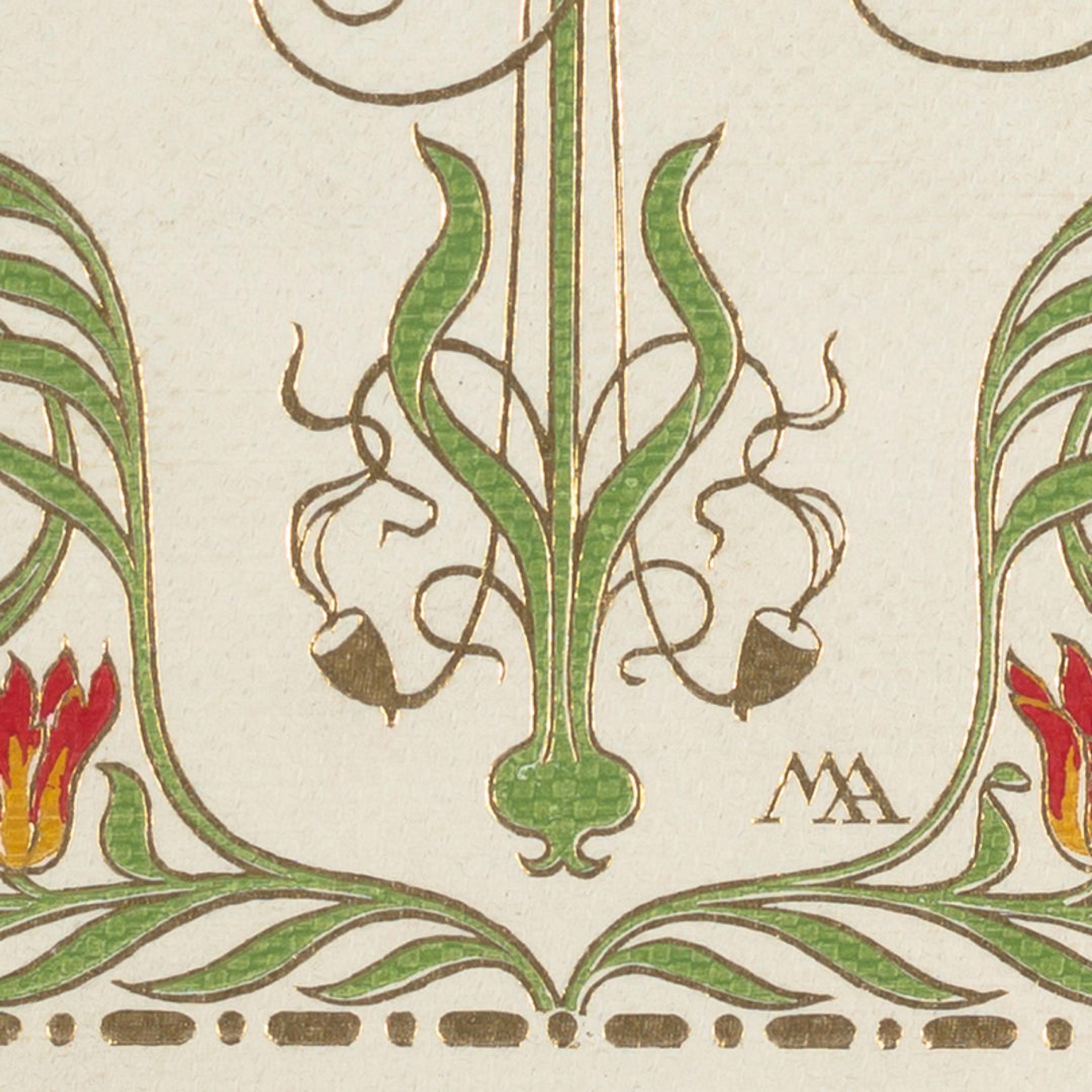 Armstrong’s first book cover design, for Sweet William by Marguerite Bouvet, was published in 1890. Early in her career she faced reluctance placing her designs with publishers, as the field of book cover design was dominated by men. To surmount this challenge, she signed her early submissions “M.N. Armstrong.” However, the years 1892–93 were groundbreaking for women book cover designers: several important exhibitions in prominent clubs and at the World’s Columbian Exposition featured women designers and paved the way for the success they enjoyed during the next decades.