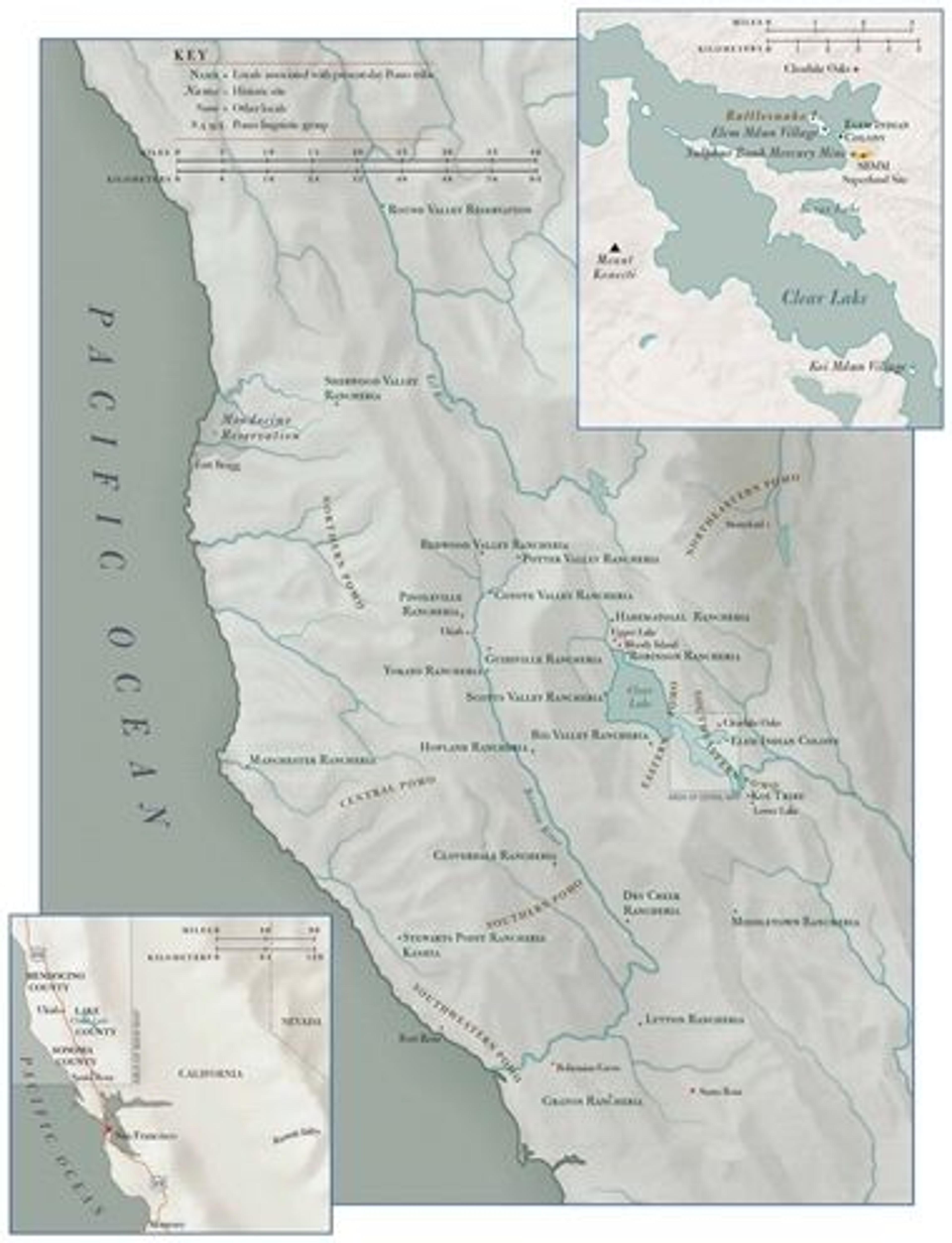 Image: Map of Northern California showing Pomo linguistic groups and present-day Pomo tribes. View full-size PDF.