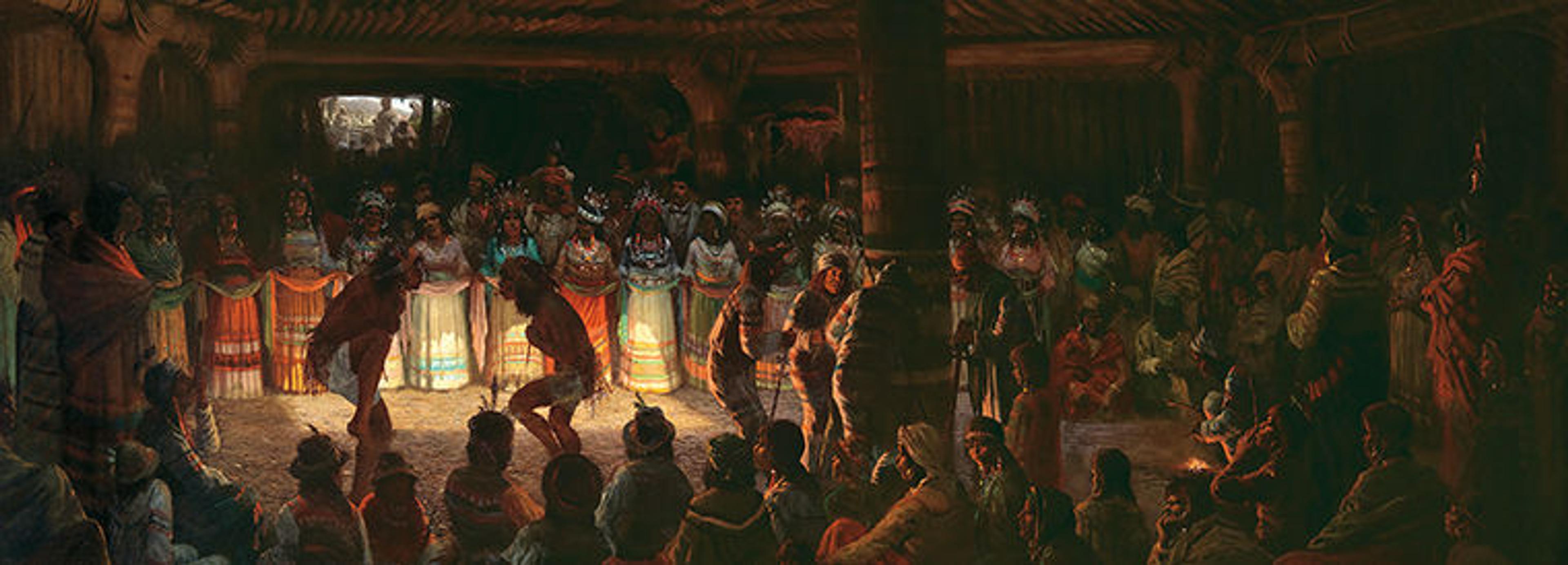 In 1876 the French-born and -trained American artist Jules Tavernier received the most important commission of his career from San Francisco’s leading banker, Tiburcio Parrott. The resulting painting—Dance in a Subterranean Roundhouse at Clear Lake, California—commemorates an extraordinary experience Parrott shared with Parisian business associate Baron Edmond de Rothschild. Earlier that year, both men were privileged to witness a ceremonial mfom Xe, or “people dance,” of the Elem Pomo, an Indigenous community on the southeastern shore of Clear Lake in Northern California.