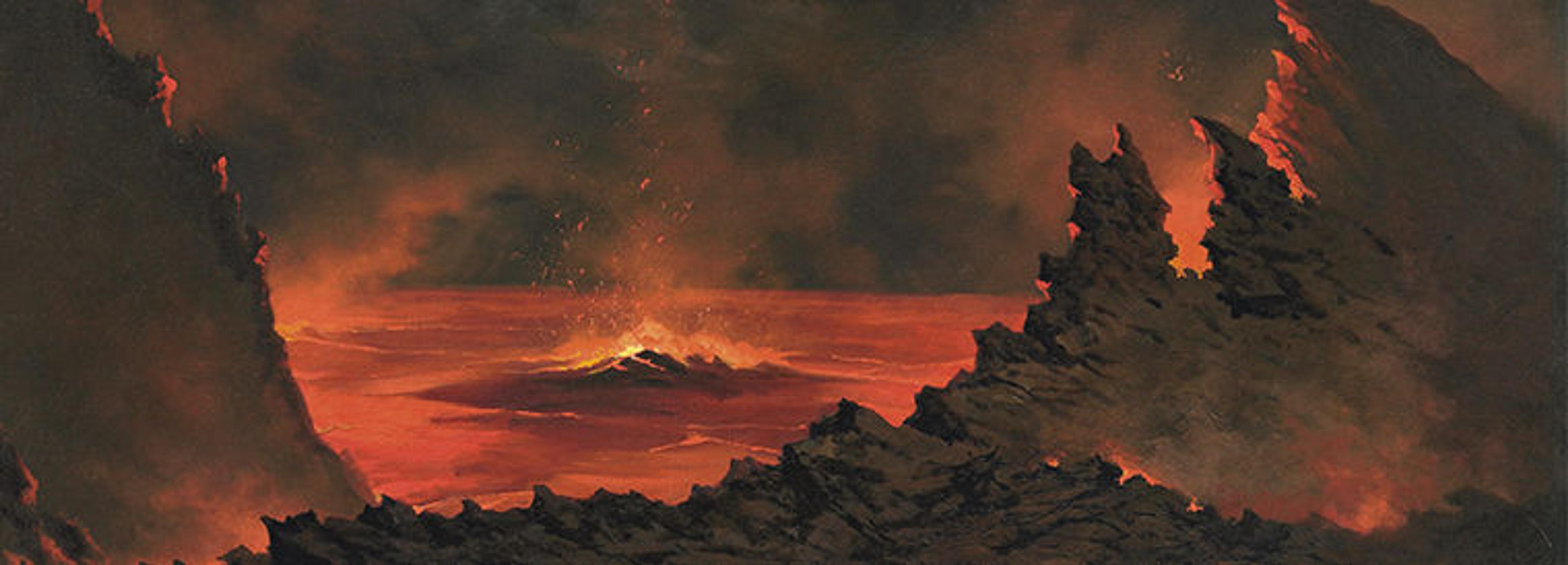 Tavernier’s bohemian lifestyle and unpaid bills forced him to flee San Francisco, traveling to Hawai‘i in search of new subjects for his art. Arriving in December of 1884, he declared it an “artist’s paradise.” By that time, volcanoes were already among the most iconic images associated with Hawai‘i. Tavernier painted a series of the islands’ active volcanoes, emphasizing the destructive and magnificent forces of nature. The success of these works launched what came to be known as the Volcano School, and fueled tourism to the islands. Pele, a powerful female deity in Hawai‘i who embodies the many manifestations of volcanism, is revered as an environmental force capable of changing land formations. Well-circulated stories of Pele made Tavernier’s paintings all the more marketable to visitors.