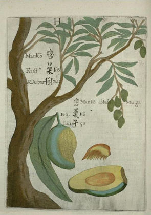 Right: The earliest known illustration of a mango tree and fruit, from Michael Boym's Flora Sinensis: Frvctvs Floresqve Hvmillimi Porrigens