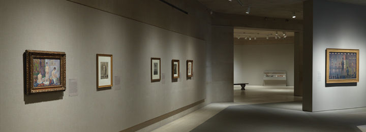 Seurat's sustained fascination with the theme of the parade unfolds on this wall, which situates Circus Sideshow in relation to the conté crayon drawings that advanced his conception and the figure painting he developed and exhibited in tandem—a contrasting daytime, indoor studio scene. On the wall opposite, Seurat's choice of subject is amplified by the work of commercial illustrators and poster designers, whose efforts serve not only to contextualize Seurat's magisterial composition but also to clarify its elusive imagery.