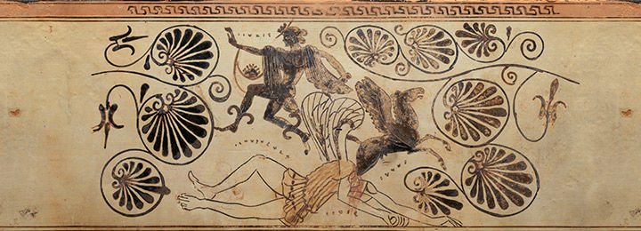 The sphinx, a mythological creature with a lion's body and a human head, originated in Egypt and has been known throughout the eastern Mediterranean since the Bronze Age. The Greeks represented the sphinx as a winged lioness with a woman's head. Statues of sphinxes flanked the entrance of tombs or crowned grave markers, guarding against and punishing those who would disturb the dead. On one stele, noted for its polychromy, the sphinxes' femininity is emphasized with necklaces and elaborate diadems worn on long, elegantly coiffed hair.