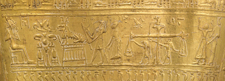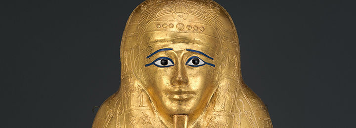 Gilded coffin belonging to the priest of Heryshef, Nedjemankh (detail). Late Ptolemaic to early Roman Period, first century B.C. Cartonnage (linen, glue, gesso), gesso, paint, gold, silver, resin, glass, wood, leaded bronze. Lid: 71 1/4 x 20 7/8 x 11 in. (181 x 53 x 28 cm); base: 70 7/8 x 21 1/4 x 4 3/4 in. (180 x 54 x 12 cm)