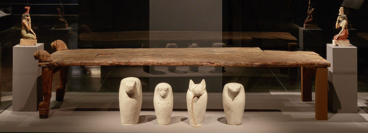 Nedjemankh, the priest at the center of this installation, would have believed that it was essential to follow ancient Egyptian funerary ritual in order to preserve his body and assist his spirit as he traveled from his known life to a coveted eternal existence. The coffin was the primary vehicle in his time for assembling the elements essential for this transformation, and Nedjemankh commissioned a spectacular example. He had a human-shaped cartonnage decorated inside and out with numerous vignettes and symbols designed to protect his mummified body and his spirit. The most important aspect of the coffin is the hymn inscribed above the feet that speaks of gold and silver, both associated with divinity. The application of costly metals to the surfaces translates the hymn's words literally, assuring Nedjemankh's eternal existence as a divine being. Also presented in this space are temple and funerary equipment and artworks that elucidate the time in which Nedjemankh lived, the role he played in Egyptian society, and the significance of the elaborate decorative narrative on his coffin.