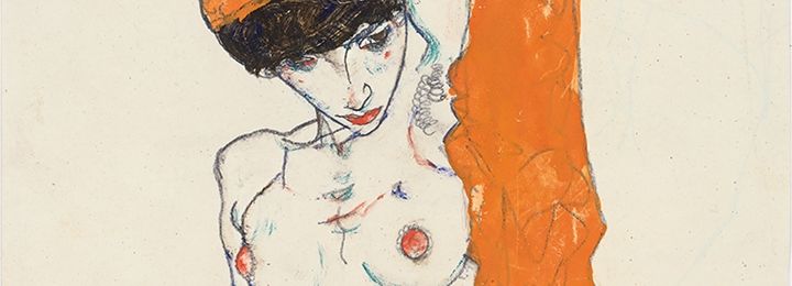 Egon Schiele (Austrian, 1890–1918). Standing Nude with Orange Drapery (detail), 1914. Watercolor, gouache and graphite on paper, 18 3/8 in. x 12 in. (46.7 x 30.5 cm). The Metropolitan Museum of Art, New York, Bequest of Scofield Thayer, 1982 (1984.433.315ab)