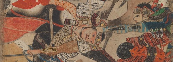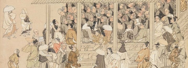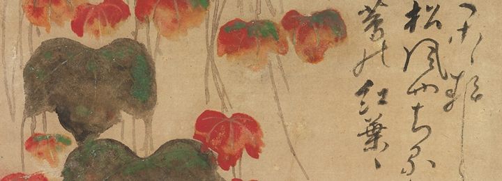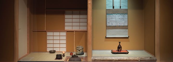 In preparation for the tea ceremony, the host makes a careful selection and combination (toriawase) of utensils in order to tell a story or create a mood appropriate to the season or festivity. The present display focuses on the taste of the renowned tea master Sen no Rikyū (1522–1591), who created uniquely Japanese, austere surroundings for the tea ceremony, preferring domestic utensils that were often imperfect or irregular, a reflection of wabi-sabi aesthetics. Here, a letter about sake, penned by Sen no Rikyū, hangs in the tokonoma alcove; the carved bamboo tea scoop (chashaku) at left is also attributed to him. The tea bowl, titled Twilight by the Maples (Kaedegure), is attributed to Raku Chōjirō (died 1592), the first-generation master of the Kyoto-based Raku family of potters. The freshwater jar (mizusashi), in front of the tea bowl, is an example of early seventeenth-century Iga ware, while the used-water container (kensui) at back, is a sixteenth-century Chinese copper vessel. Some tea utensils could be unadorned, everyday objects that were repurposed for their aesthetic qualities or simplicity, such as the ladle rest (or kettle lid rest, futaoki), which is a seventeenth-century fishing weight.