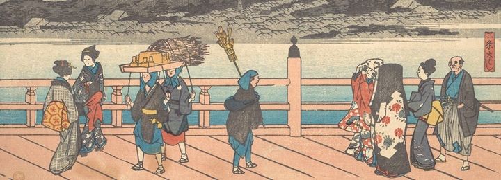 Landscape series also took inspiration from the genre known as meisho-e, or "pictures of famous places" renowned for their literary associations and for their scenic beauty. Edo-period illustrated guidebooks were a reference for artists, and improvements in Japan’s system of roadways led to an increase in tourism and a greater demand for landscape prints. In 1832 Hiroshige made a trip between Edo and Kyoto along the famed highway Tōkaidō, lodging at its fifty-three overnight stations and making sketches of everything he saw. He finished the series with compositions depicting the Kyoto area. The artist also created the Famous Places in Kyoto series in the 1830s and revisited the subject several times later in his career.