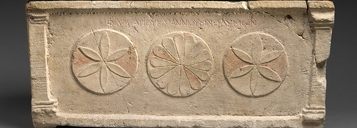 The First Roman-Jewish War, or Great Revolt, in 66–73/74 led to the destruction of the Jerusalem Temple. Another major revolt, known as the Bar Kokhba rebellion (132–35), was suppressed by the emperor Hadrian (r. 117–138), who expelled the Jewish population from Jerusalem and merged Judaea with the province of Syria to form a new province, Syria-Palaestina. This gallery includes discoveries from the Cave of Letters that offer a rare glimpse into the lives of people who sheltered there during the Bar Kokhba rebellion; other objects feature symbols of the Jerusalem Temple and expressions of Jewish identity within the Roman Empire.