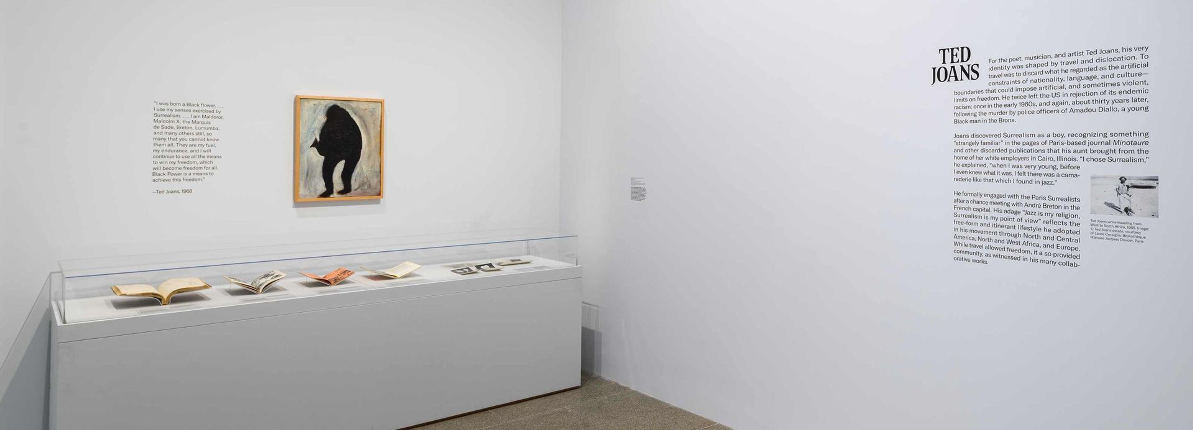 For the poet, musician, and artist Ted Joans, his very identity was shaped by travel and dislocation. To travel was to discard what he regarded as the artificial constraints of nationality, language, and culture—boundaries that could impose artificial, and sometimes violent, limits on freedom. He twice left the US in rejection of its endemic racism: once in the early 1960s, and again, about thirty years later, following the murder by police officers of Amadou Diallo, a young Black man in the Bronx. Joans discovered Surrealism as a boy, recognizing something “strangely familiar” in the pages of Paris-based journal Minotaure and other discarded publications that his aunt brought from the home of her white employers in Cairo, Illinois. “I chose Surrealism,” he explained, “when I was very young, before I even knew what it was. I felt there was a camaraderie like that which I found in jazz.”