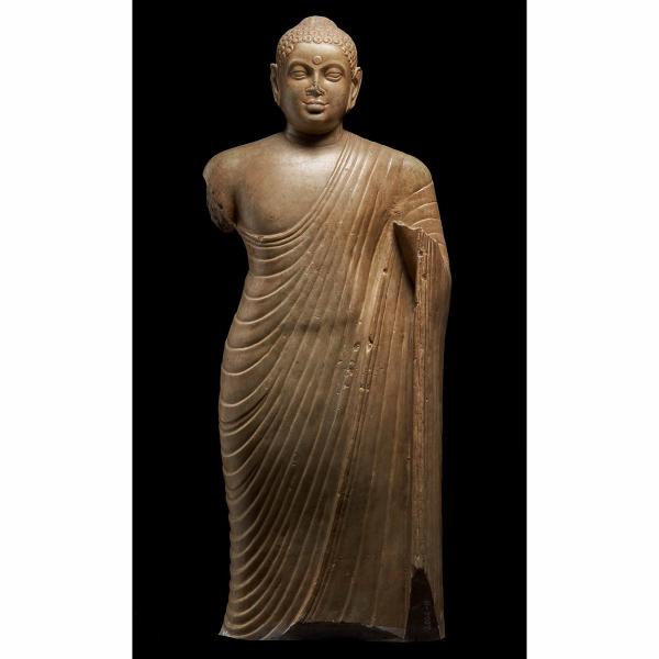 The emergence of freestanding figurative representations of the Buddha in southern India is linked to a shift away from narrative reliefs—storytelling for monastics and the lay community—toward the veneration of the Buddha as a religious icon. The limestone Buddha images in this room, all carved in the round, date to the third and fourth centuries CE. These sculptures typically occupied freestanding shrines, the images installed in the semicircular apse. This became a regular feature of later monastic architecture. The figures display the sculptors’ careful attention to the drape of the garment over the body, with the deep fluting of the outer robe giving shape to the figure beneath. The powerful gesture of the raised left hand, accentuated by the sweeping folds of a tightly drawn robe, was likely inspired by Roman dress, images of which circulated on coins.