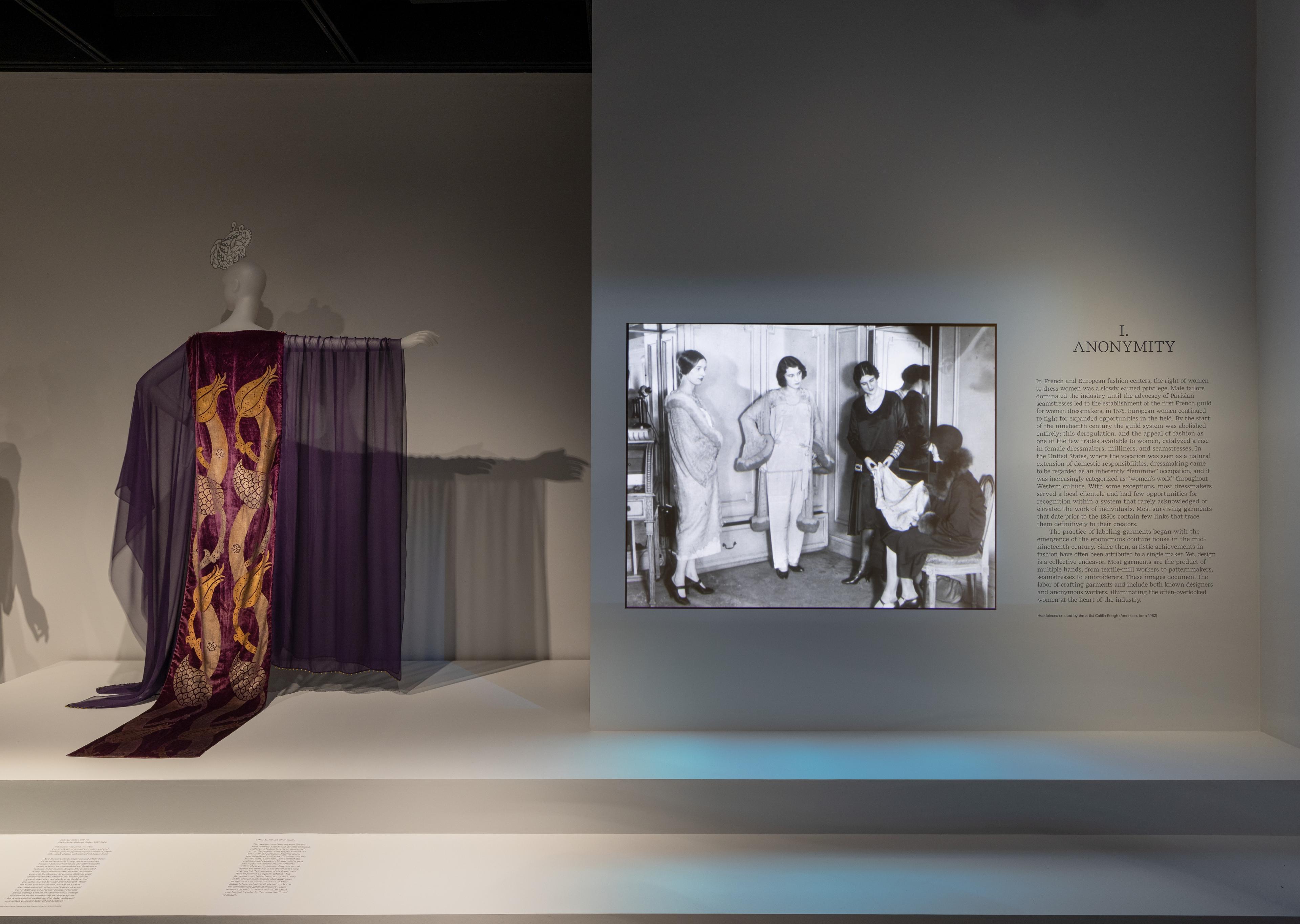 The exhibition is anchored by four key notions that underlie the historical trajectory of women working in fashion: anonymity, visibility, agency, and absence/omission. While the center sections explore stories of progress and success for women designers, the first and last acknowledge some of the challenges that women have encountered in navigating the fashion system—functioning as a prologue and epilogue of sorts that signal an ongoing conversation rather than a complete history.