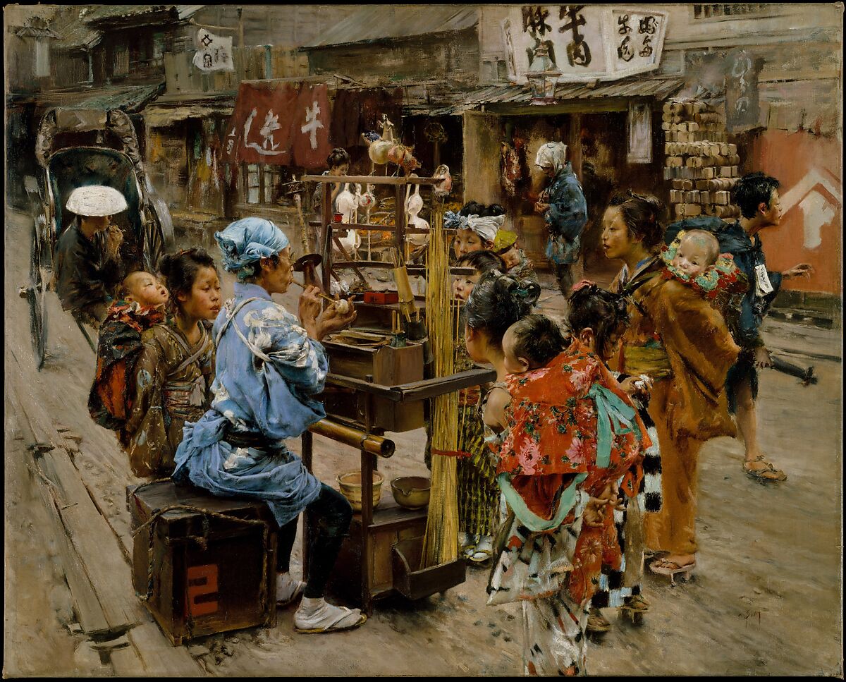 Blum went to Japan in 1890 to produce illustrations for a series of articles for Scribner’s Magazine, spending eighteen months there. His illustrated accounts of his experiences were published in 1893 and included an image titled The Ameya, on which he based this painting. Blum wrote of another depiction of an ameya, or candy blower: "Very interesting things they do certainly perform . . . using the candy like a glassblower his lump of molten glass, and producing results, if hardly as beautiful or durable, certainly as artistic and finished as regards workmanship."