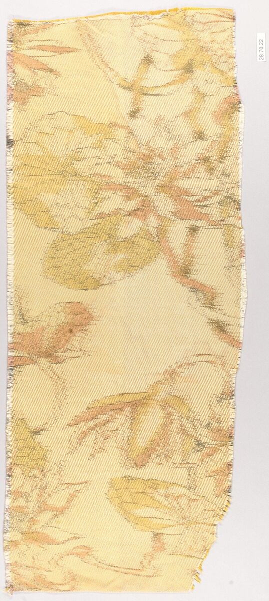 This piece of "shadow silk" with the water-lily design varies somewhat from the two others in the Met’s collection (28.70.14, 2002.355.2); here a slightly different weaving technique has distorted the warp-printed image even further. The watery look is part of the design’s intended effect: to suggest the movement of leaves and blossoms as they float on the water’s surface.